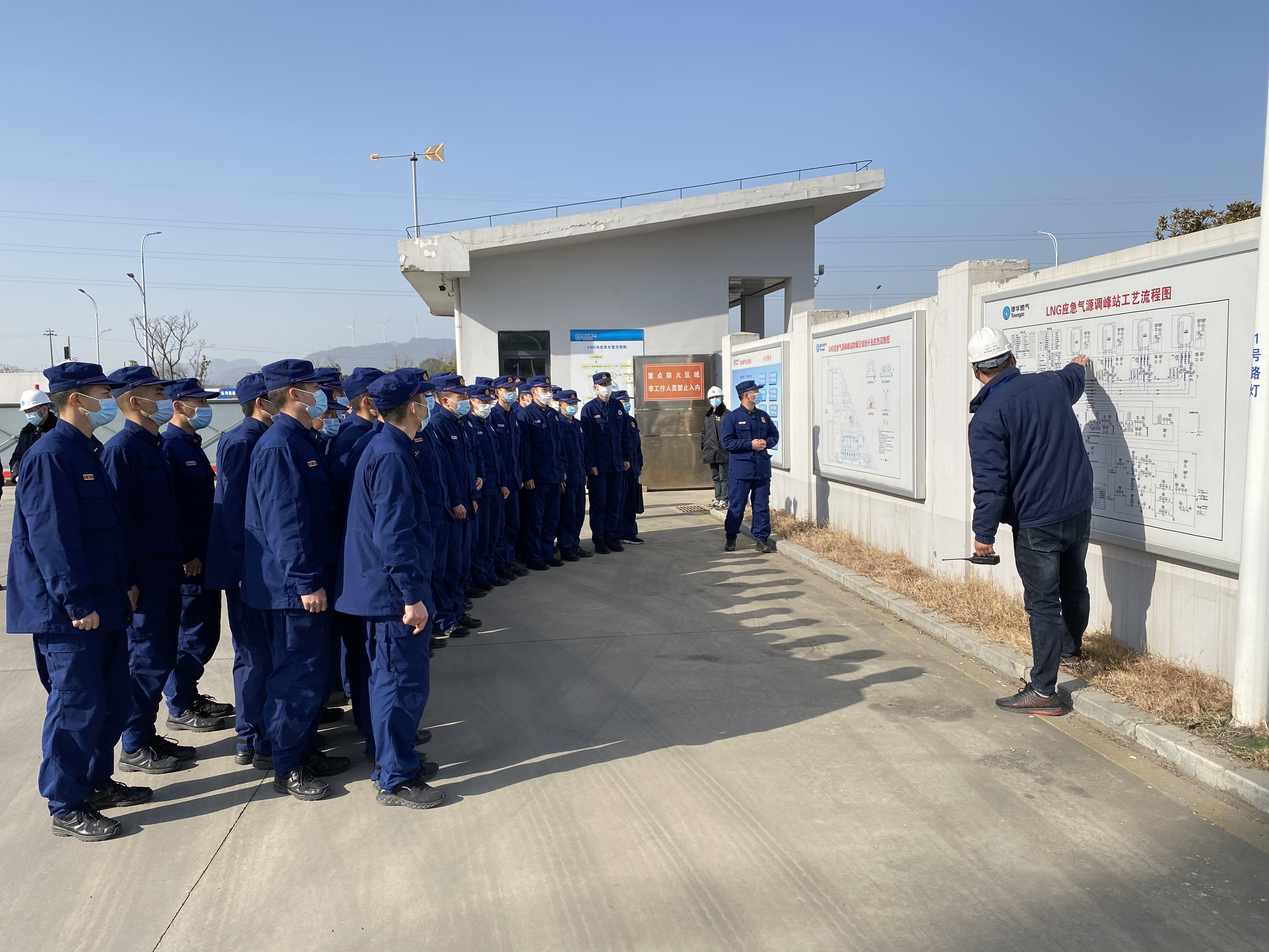 1月12日上午,市消防支隊副支隊長周燦率市區(qū)大中隊指戰(zhàn)員至安慶港華北部新城LNG(液化天然氣)應(yīng)急調(diào)峰站,開展消防安全工作交流,公司常務(wù)副總楊善俊及相關(guān)部門負(fù)責(zé)人陪同。