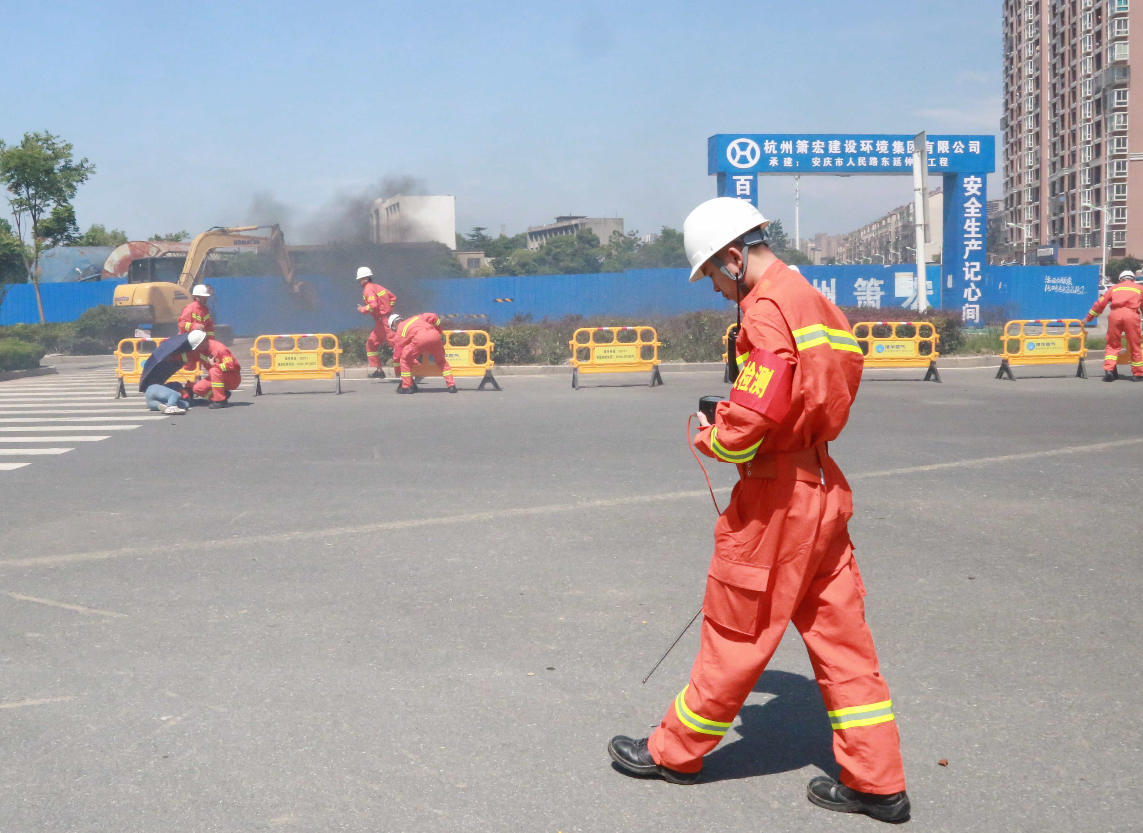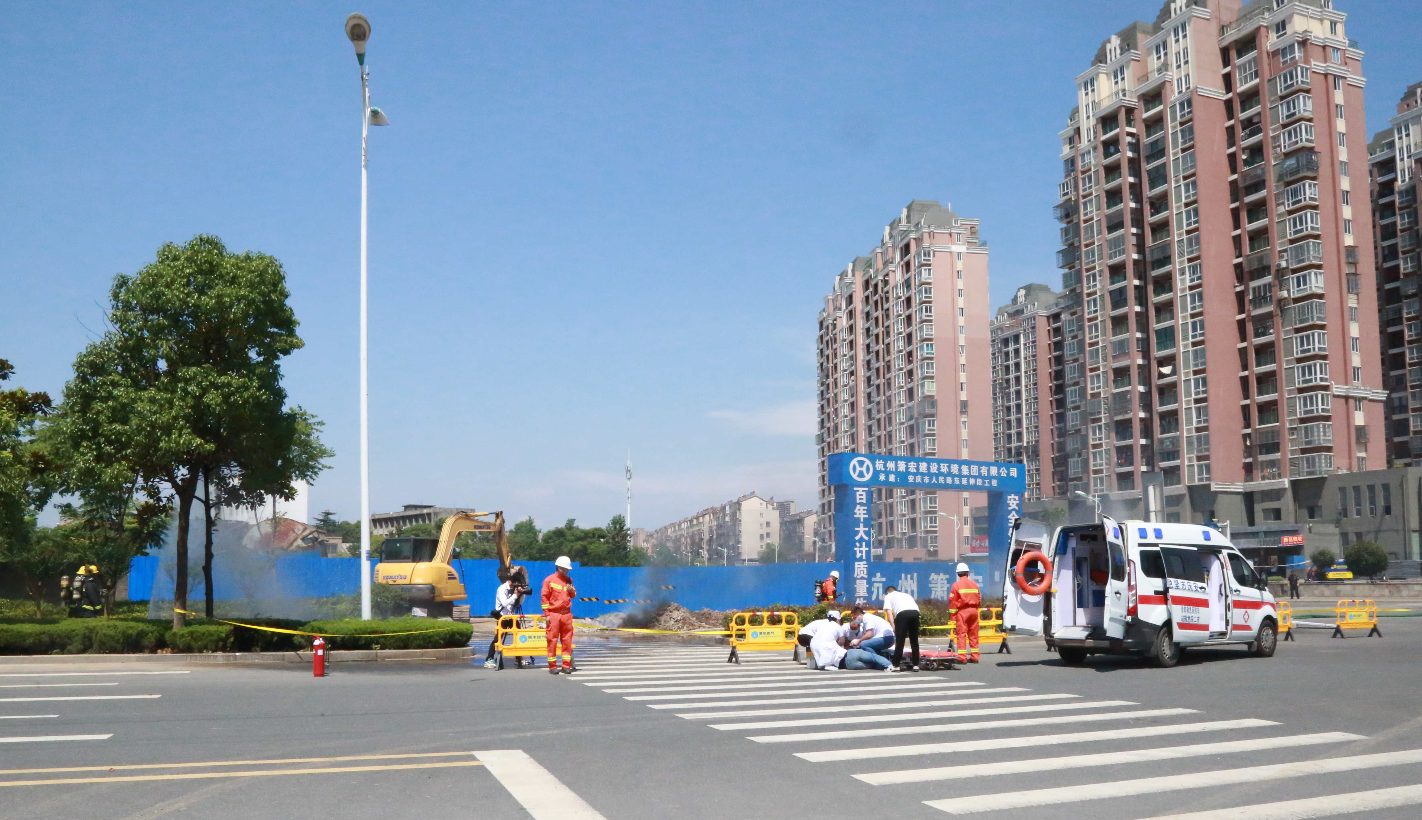 本次演練現(xiàn)場(chǎng)模擬了因第三方施工單位違章作業(yè)挖破安慶市迎江區(qū)獨(dú)秀大道水岸花都小區(qū)南側(cè)(獨(dú)秀大道與華中東路交叉口南行約200米)的地下中壓天然氣管道,引發(fā)天然氣泄漏后遇火源發(fā)生爆燃,造成多名人員受傷,同時(shí)泄漏的燃?xì)膺€竄至附近水岸花都小區(qū)市政管網(wǎng),隨時(shí)可能引發(fā)爆炸事故,威脅小區(qū)約3000戶居民及商戶生命財(cái)產(chǎn)安全。接到報(bào)警電話后,安慶港華燃?xì)馀c市公安局、市消防救援支隊(duì)、市衛(wèi)健委、迎江區(qū)政府、龍獅橋鄉(xiāng)政府等單位及時(shí)組織力量趕赴現(xiàn)場(chǎng),并按照《安慶市城市燃?xì)馐鹿蕬?yīng)急預(yù)案》要求協(xié)同配合,有序開(kāi)展現(xiàn)場(chǎng)警戒、群眾疏散、傷員救治、消防救援、搶險(xiǎn)搶修等應(yīng)急處置工作。