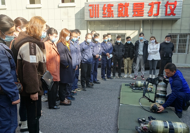 培訓(xùn)中,消防特勤中隊教官詳細(xì)講解了各消防器材的種類、性能、適用火種和操作要領(lǐng),重點演示了干粉滅火器的使用、消防服和空氣呼吸器的穿戴以及消防水帶的使用等,并現(xiàn)場指導(dǎo)港華員工依次進行滅火相關(guān)實操練習(xí)。