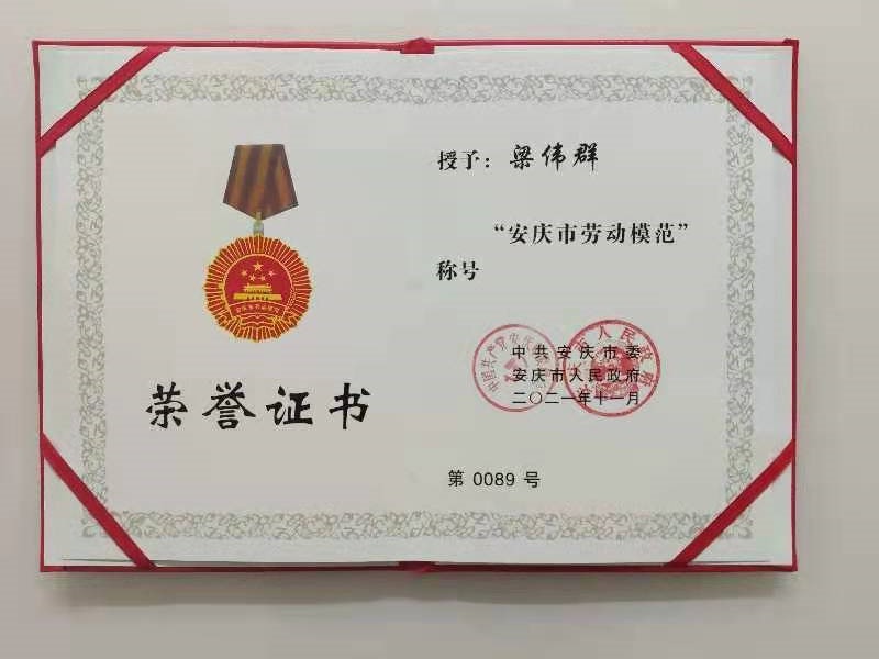 近日,在市委、市政府召開的市勞動模范、先進工作者和先進集體表彰大會上,公司員工梁偉群被授予“安慶市勞動模范”。