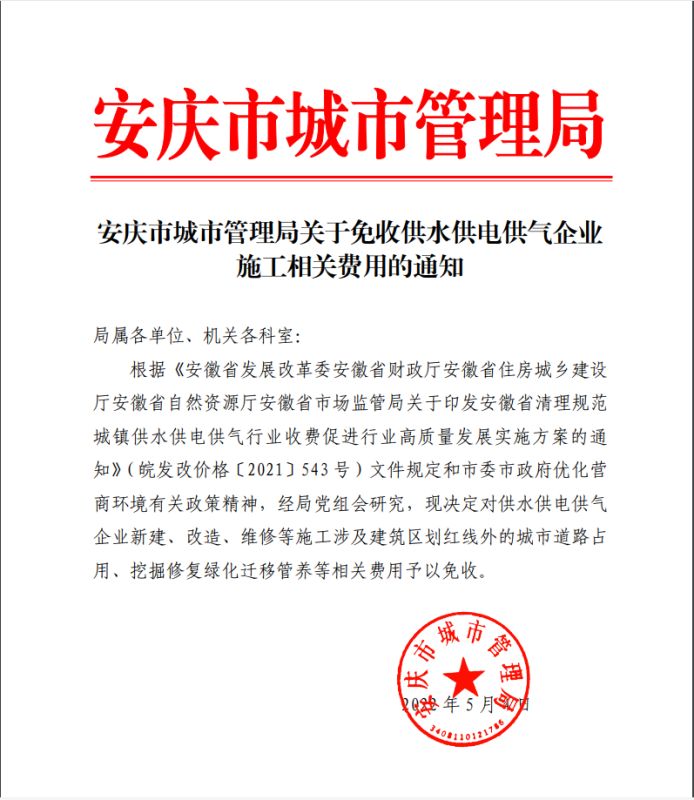 安慶市城市管理局關(guān)于免收供水供電供氣企業(yè)施工相關(guān)費用的通知