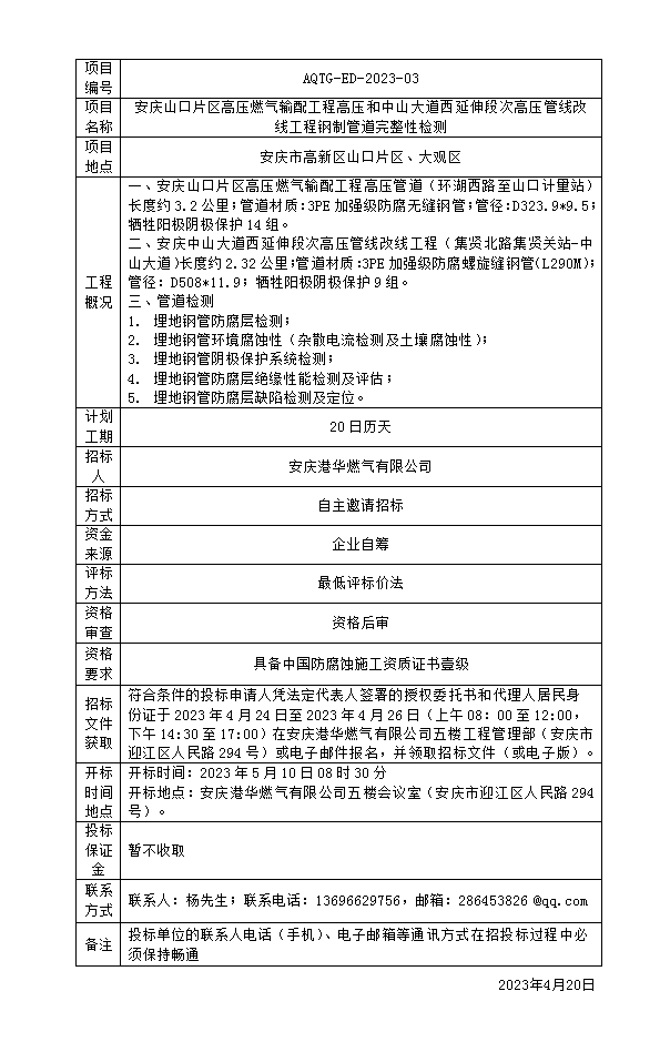 安慶山口片區(qū)高壓燃?xì)廨斉涔こ谈邏汉椭猩酱蟮牢餮由於未胃邏汗芫€改線工程鋼制管道完整性檢測(cè)招標(biāo)公告