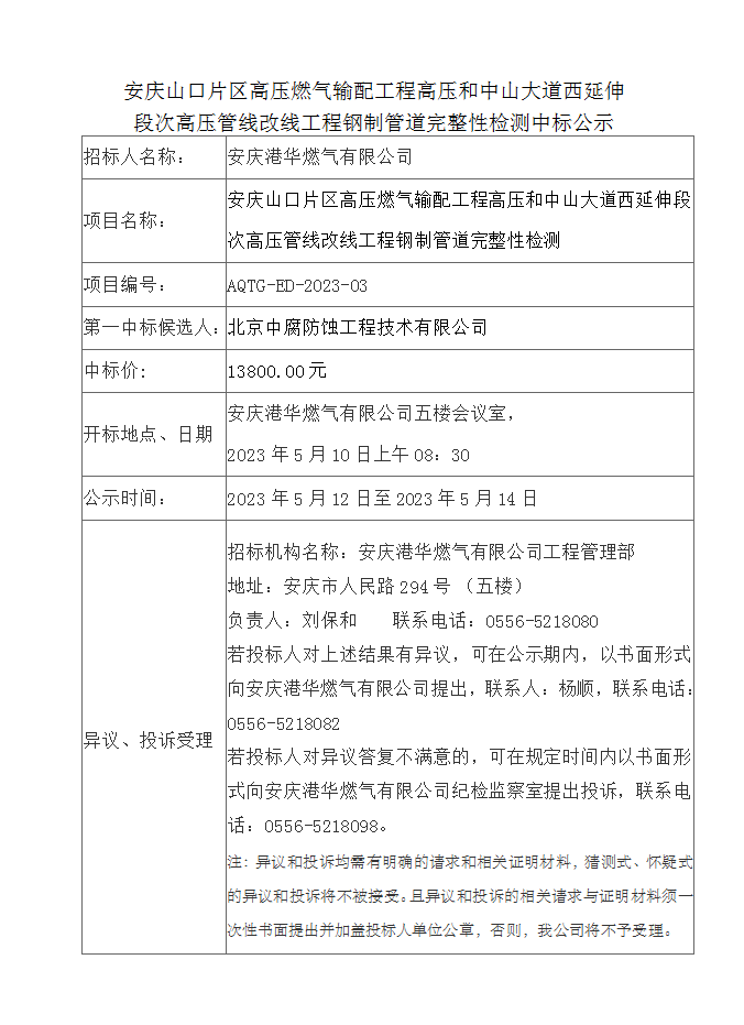 安慶山口片區(qū)高壓燃?xì)廨斉涔こ谈邏汉椭猩酱蟮牢餮由於未胃邏汗芫€改線工程鋼制管道完整性檢測中標(biāo)公示