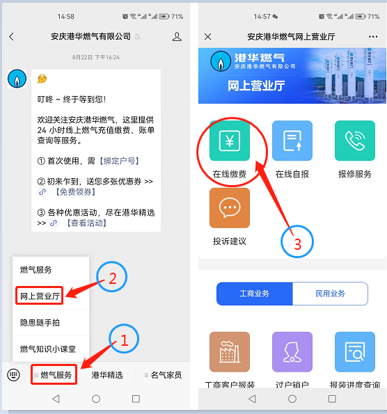 微信公眾號:關(guān)注我公司微信公眾號“安慶港華燃?xì)庥邢薰尽?,點擊“燃?xì)夥?wù)”-“網(wǎng)上營業(yè)廳”,在網(wǎng)上營業(yè)廳中選擇“在線繳費(fèi)”,即可繳納燃?xì)赓M(fèi)或者預(yù)存氣費(fèi)。