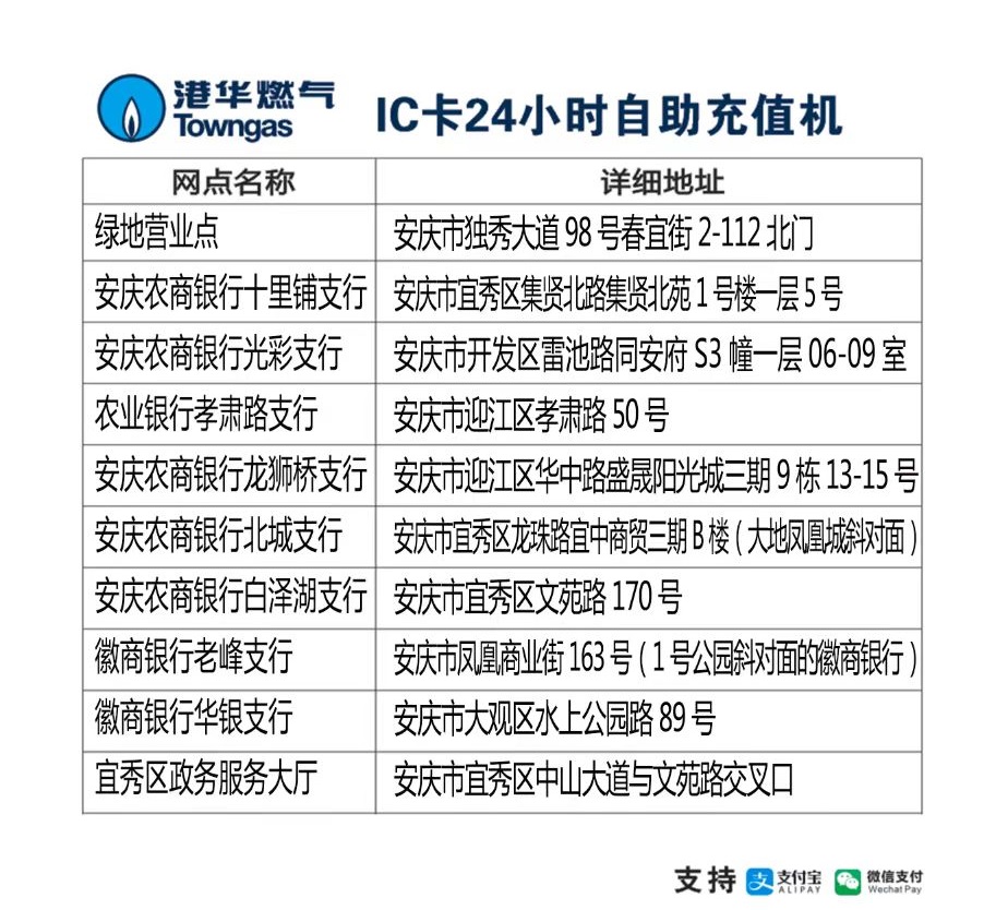 目前我公司支持交通銀行、徽商銀行、郵政儲蓄銀行、工商銀行、農(nóng)業(yè)銀行和浦發(fā)銀行的網(wǎng)上銀行和手機(jī)銀行,以及移動“中國移動”、電信“翼支付”、我公司微信公眾號和在“微信”-“生活繳費(fèi)”、“支付寶”-“生活繳費(fèi)”中查詢?nèi)細(xì)赓M(fèi)并繳納欠費(fèi)或預(yù)存氣費(fèi)。