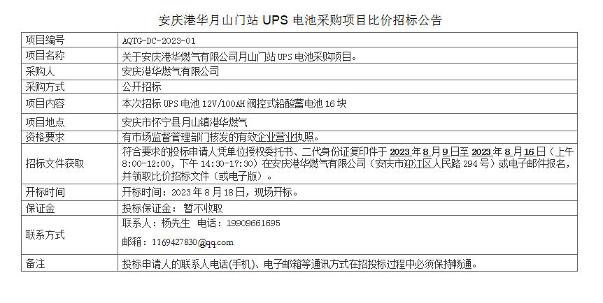 安慶港華月山門站UPS電池采購項(xiàng)目比價(jià)招標(biāo)公告