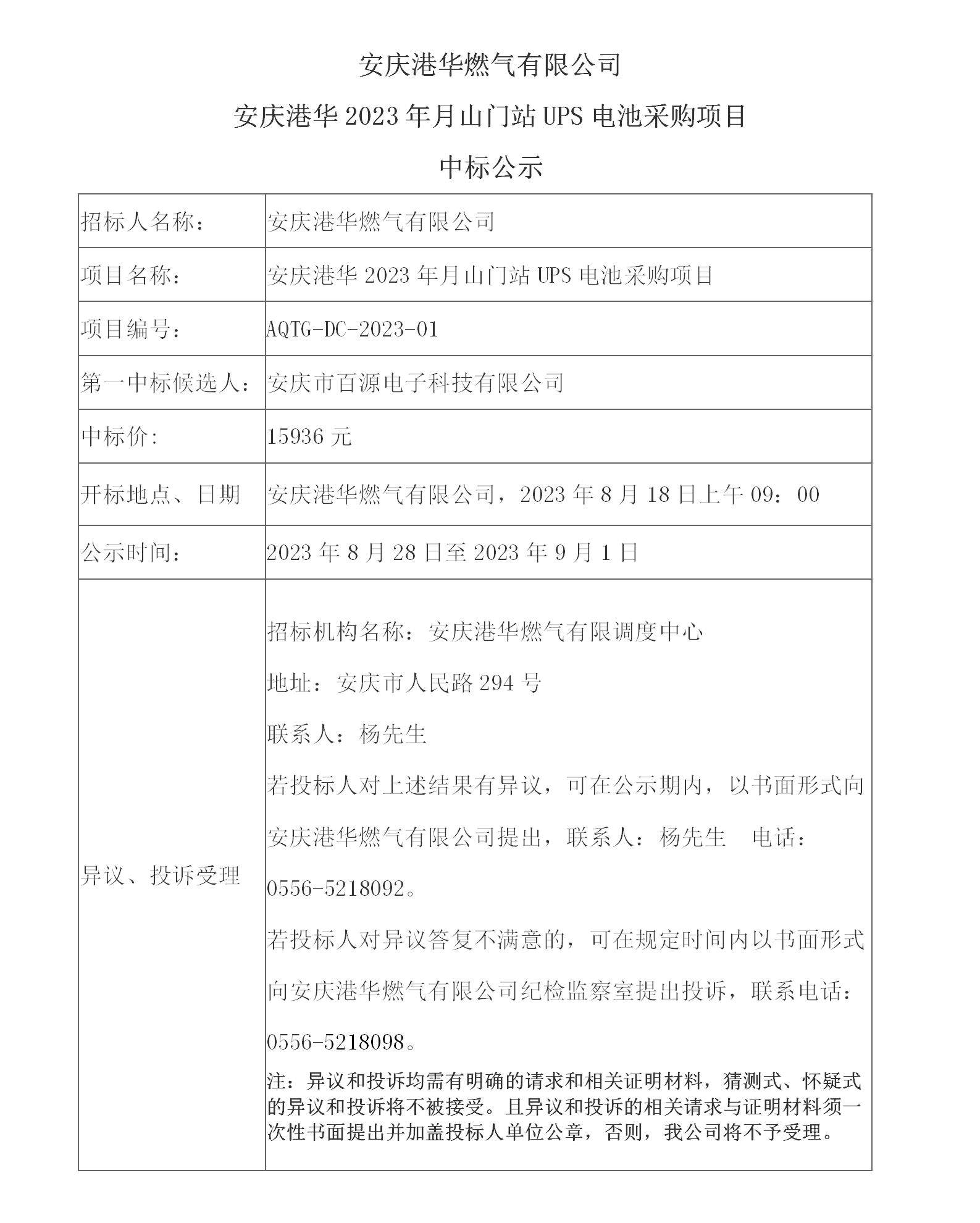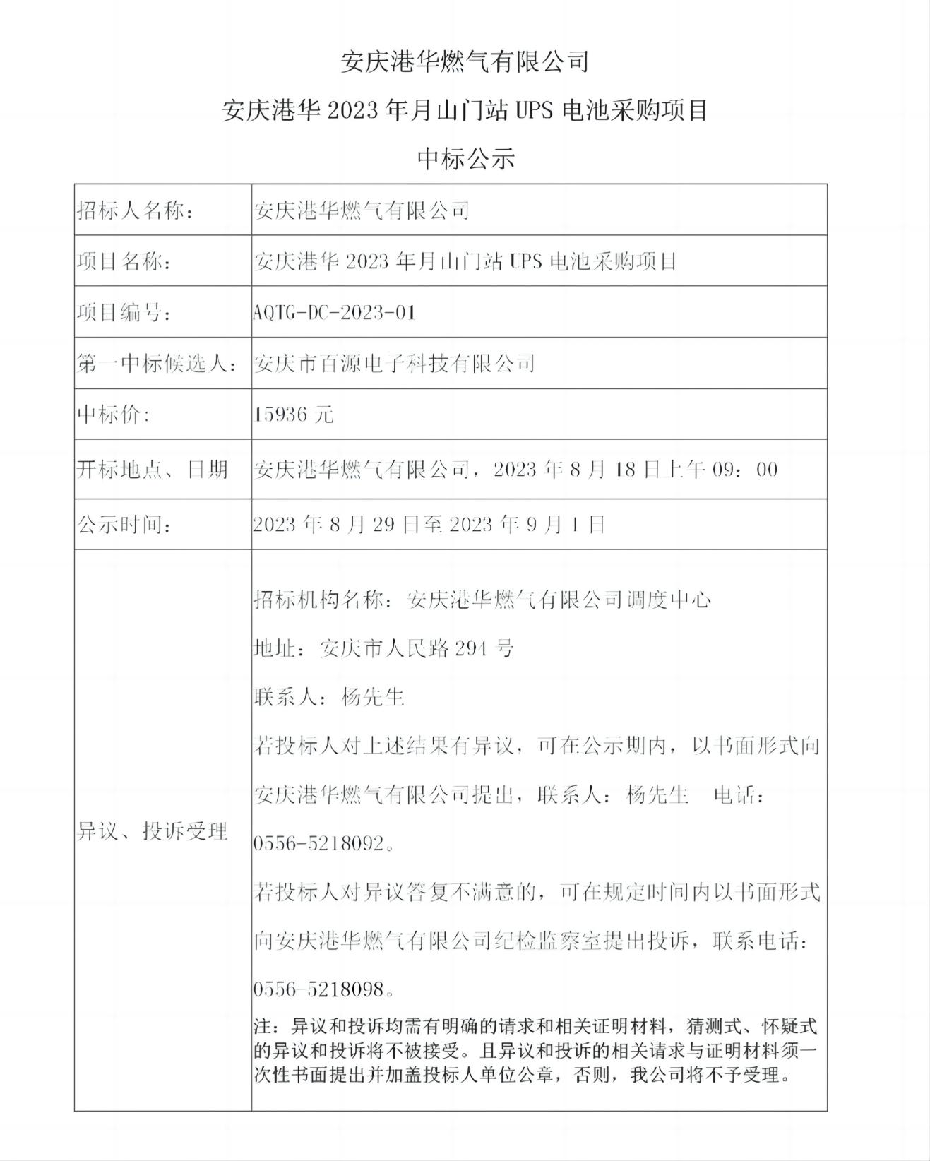 安慶港華燃?xì)庥邢薰?安慶港華2023年月山門(mén)站UPS電池采購(gòu)項(xiàng)目 中標(biāo)公示
