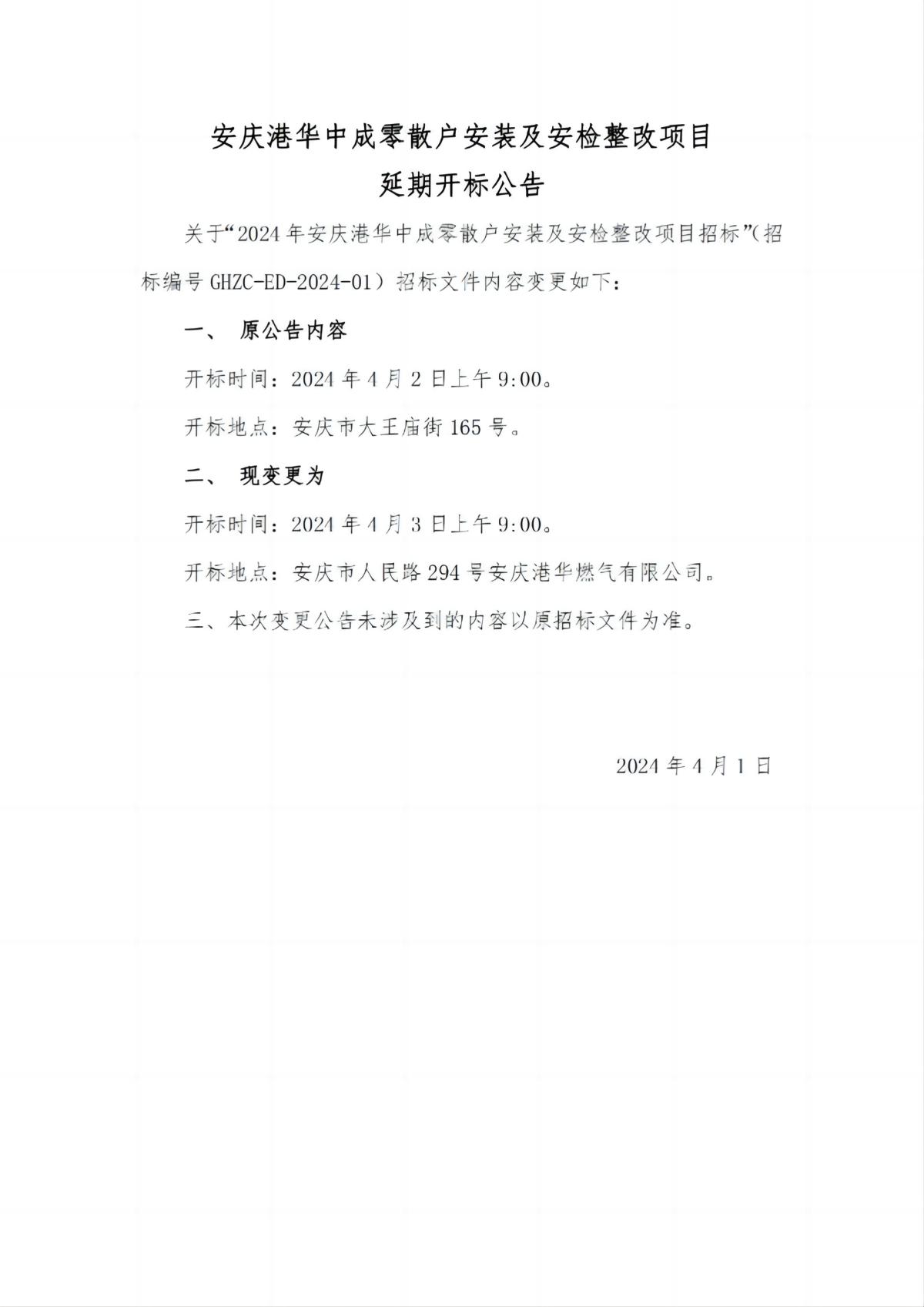 安慶港華中成零散戶安裝及安檢整改項(xiàng)目延期開標(biāo)公告