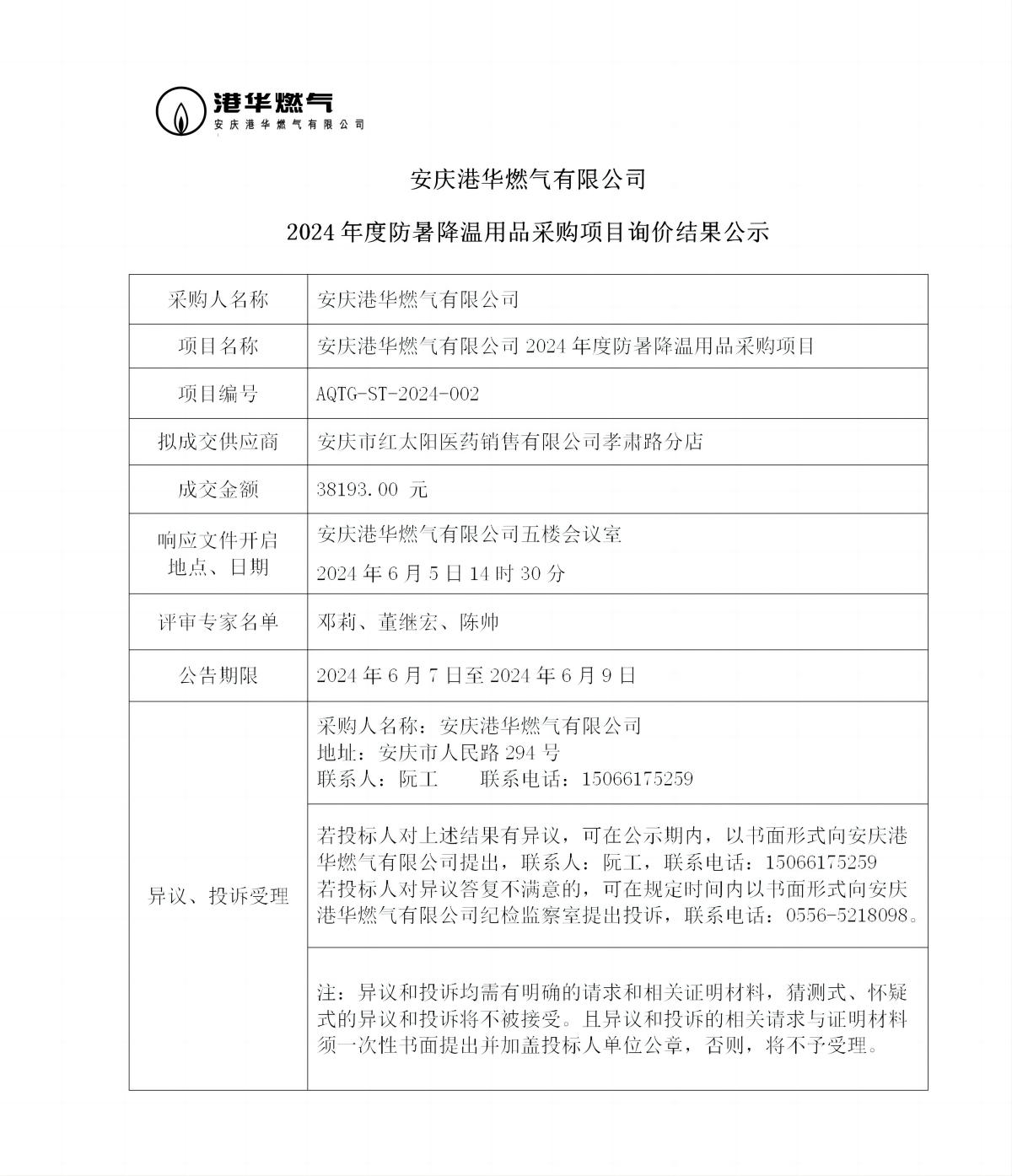 安慶港華燃氣有限公司2024年度防暑降溫用品采購項目詢價結果公示