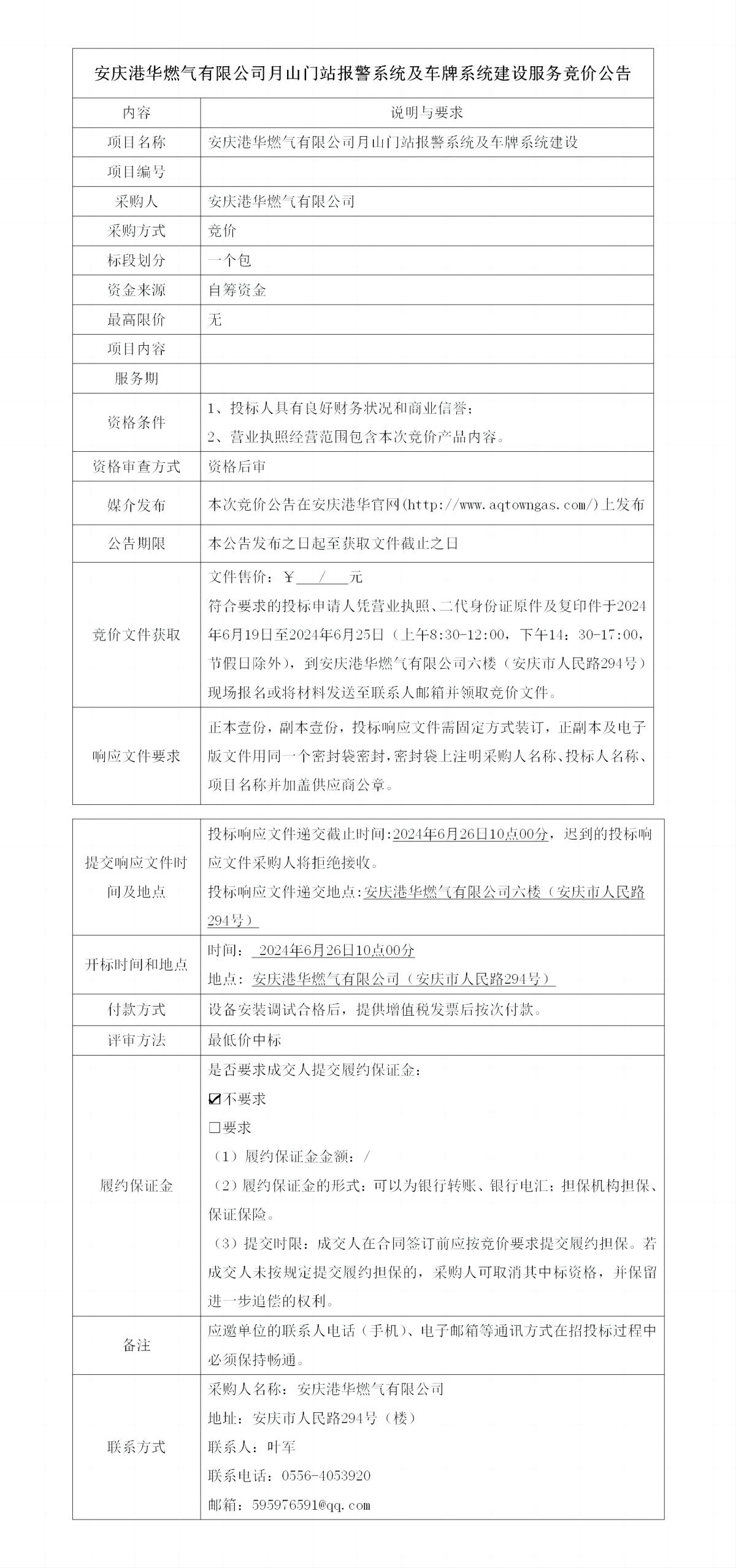 安慶港華燃?xì)庥邢薰驹律介T站報(bào)警系統(tǒng)及車牌系統(tǒng)建設(shè)服務(wù)競價(jià)公告