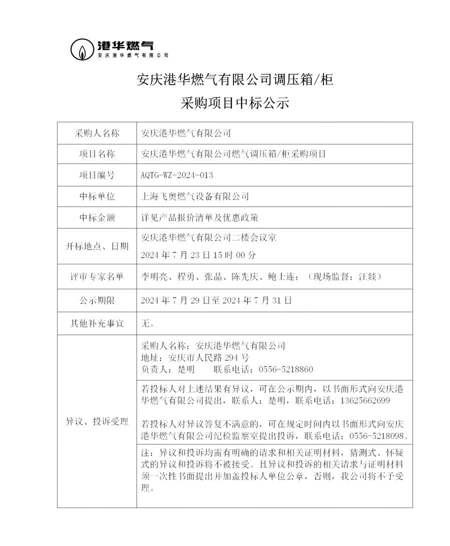 安慶港華燃?xì)庥邢薰菊{(diào)壓箱/柜采購項目中標(biāo)公示