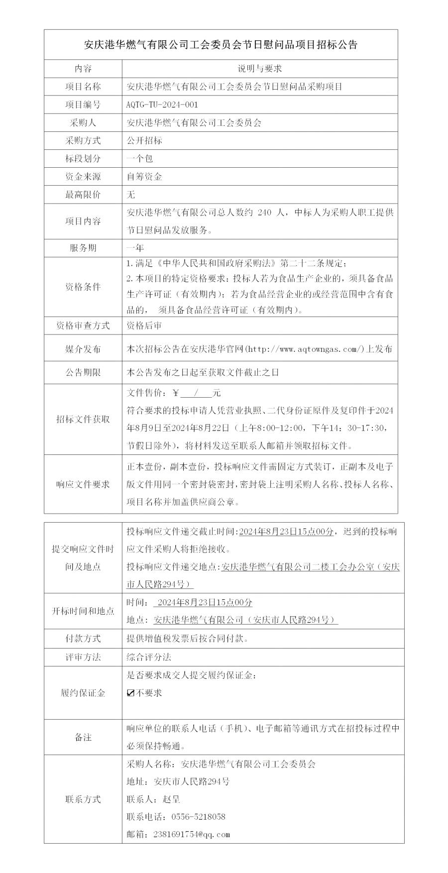 安慶港華燃?xì)庥邢薰竟?huì)委員會(huì)節(jié)日慰問品項(xiàng)目招標(biāo)公告