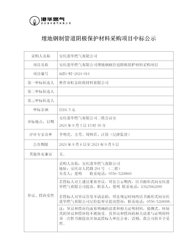 安慶港華燃?xì)庥邢薰韭竦劁撝乒艿狸帢O保護(hù)材料采購項(xiàng)目中標(biāo)公示