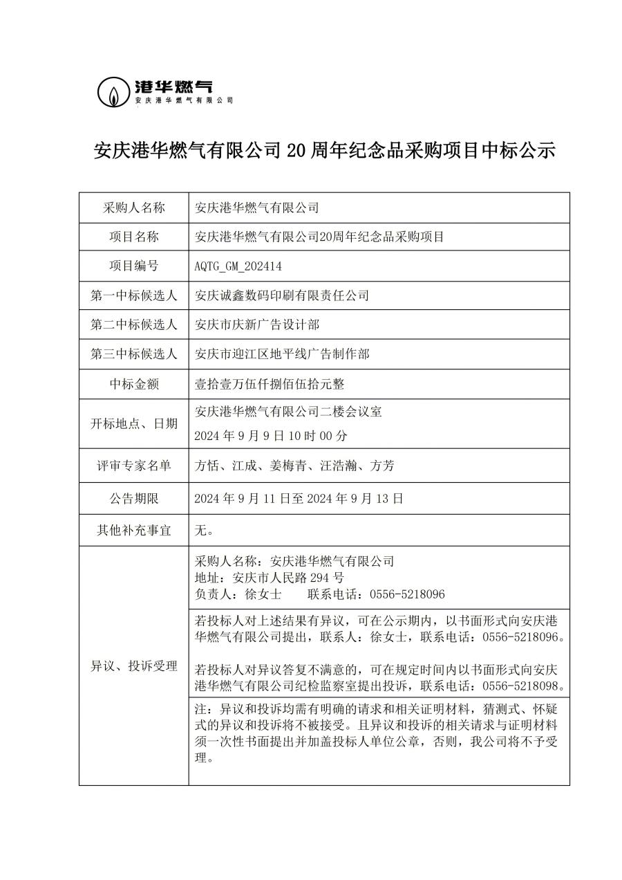 安慶港華燃氣有限公司 20 周年紀(jì)念品采購項目中標(biāo)公示