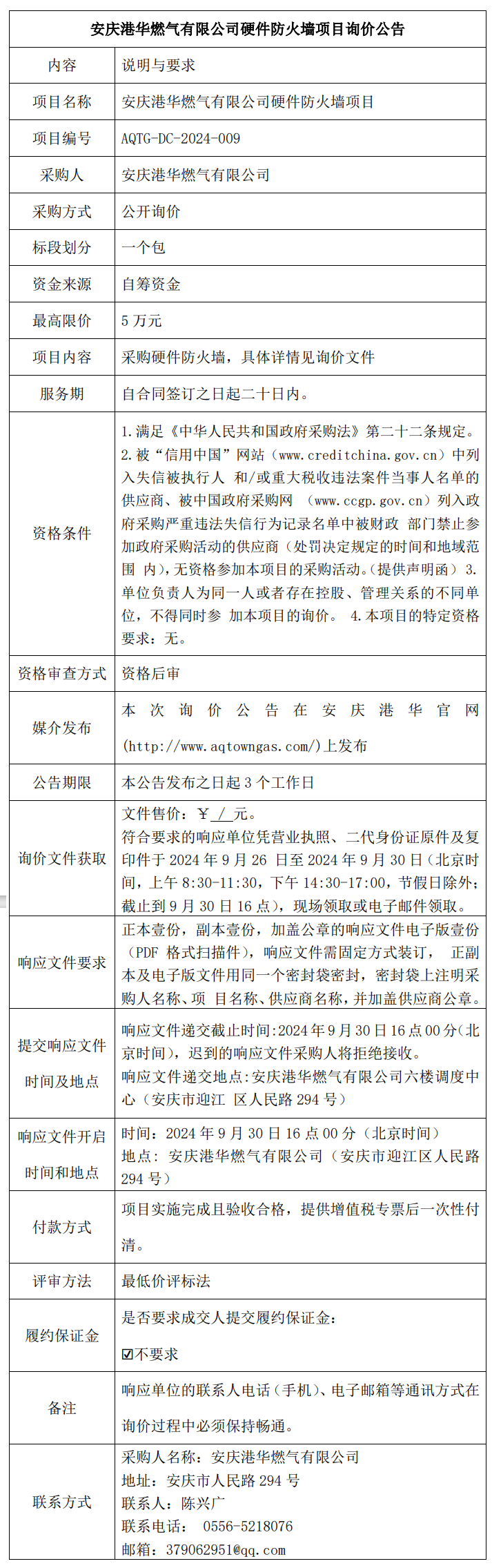 安慶港華燃?xì)庥邢薰居布阑饓?xiàng)目詢價(jià)公告