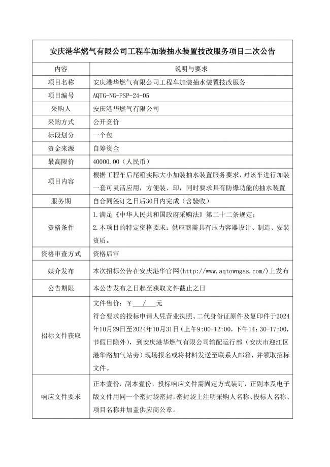 安慶港華燃氣有限公司工程車加裝抽水裝置技改服務項目二次公告 發(fā)布時間:2024-10-28    閱讀次數:2970次