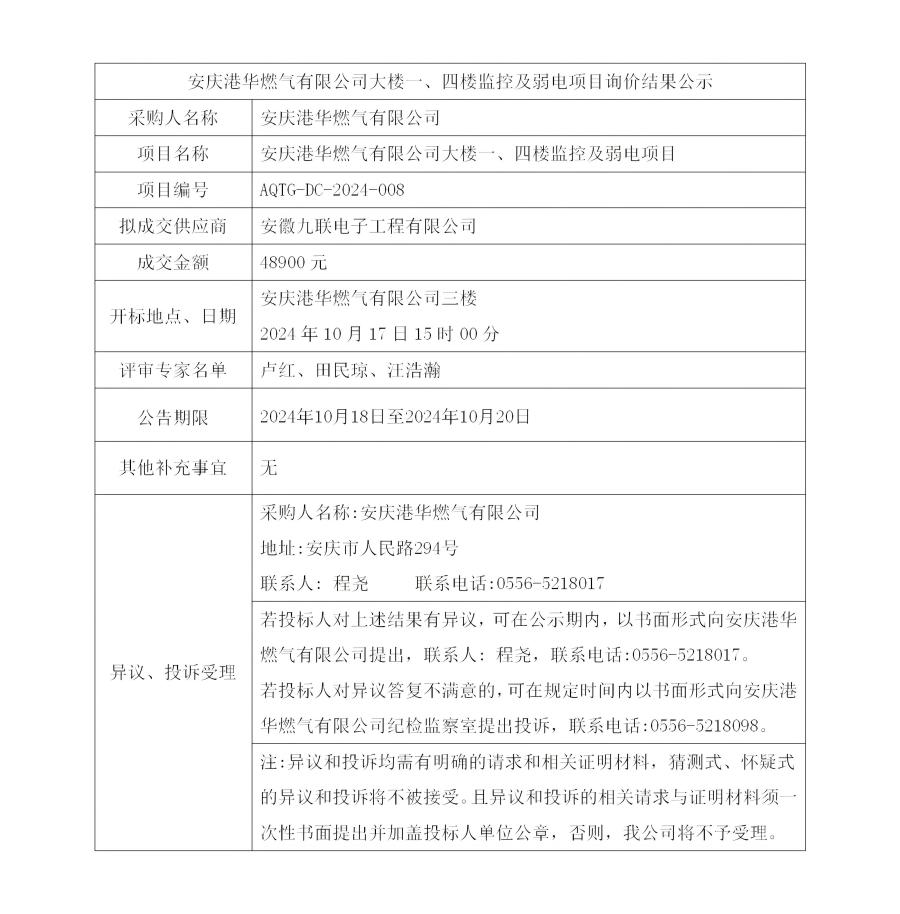 安慶港華燃?xì)庥邢薰敬髽且?、四樓監(jiān)控及弱電項(xiàng)目詢價(jià)結(jié)果公示 發(fā)布時(shí)間:2024-10-18    閱讀次數(shù):3061次
