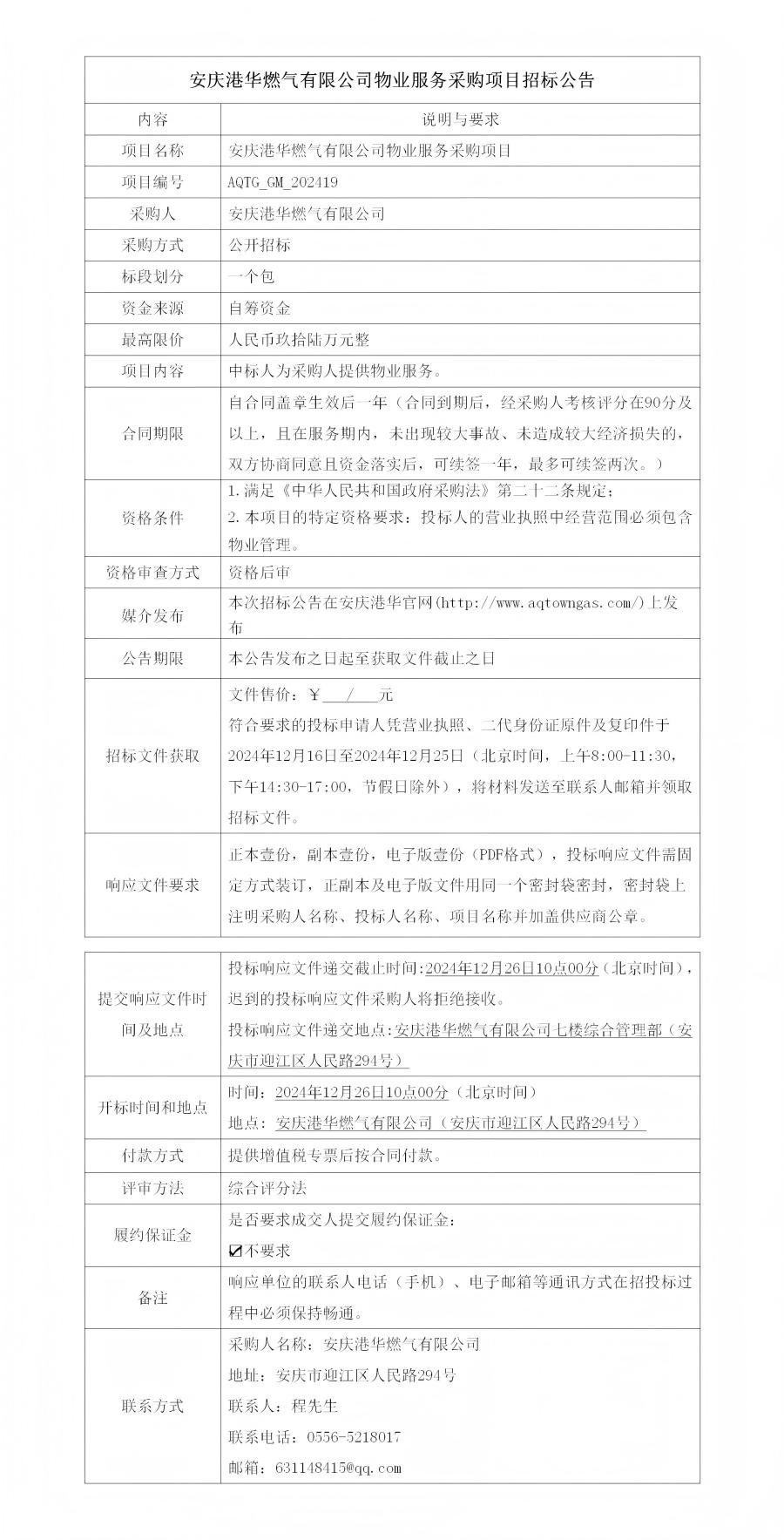 安慶港華燃?xì)庥邢薰疚飿I(yè)服務(wù)采購(gòu)項(xiàng)目招標(biāo)公告 發(fā)布時(shí)間:2024-12-16    閱讀次數(shù):2960次
