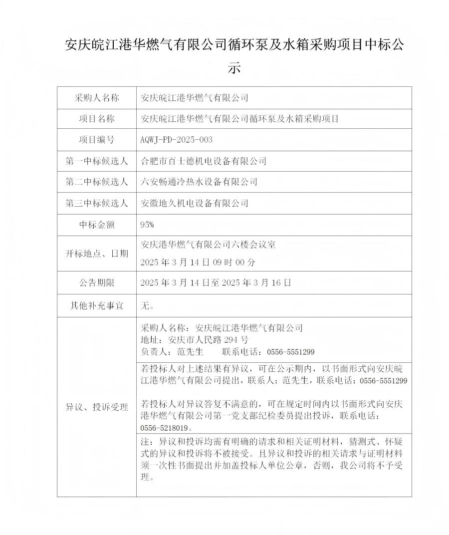 安慶皖江港華燃?xì)庥邢薰狙h(huán)泵及水箱采購項(xiàng)目中標(biāo)公示 發(fā)布時(shí)間:2025-03-14    閱讀次數(shù):2038次