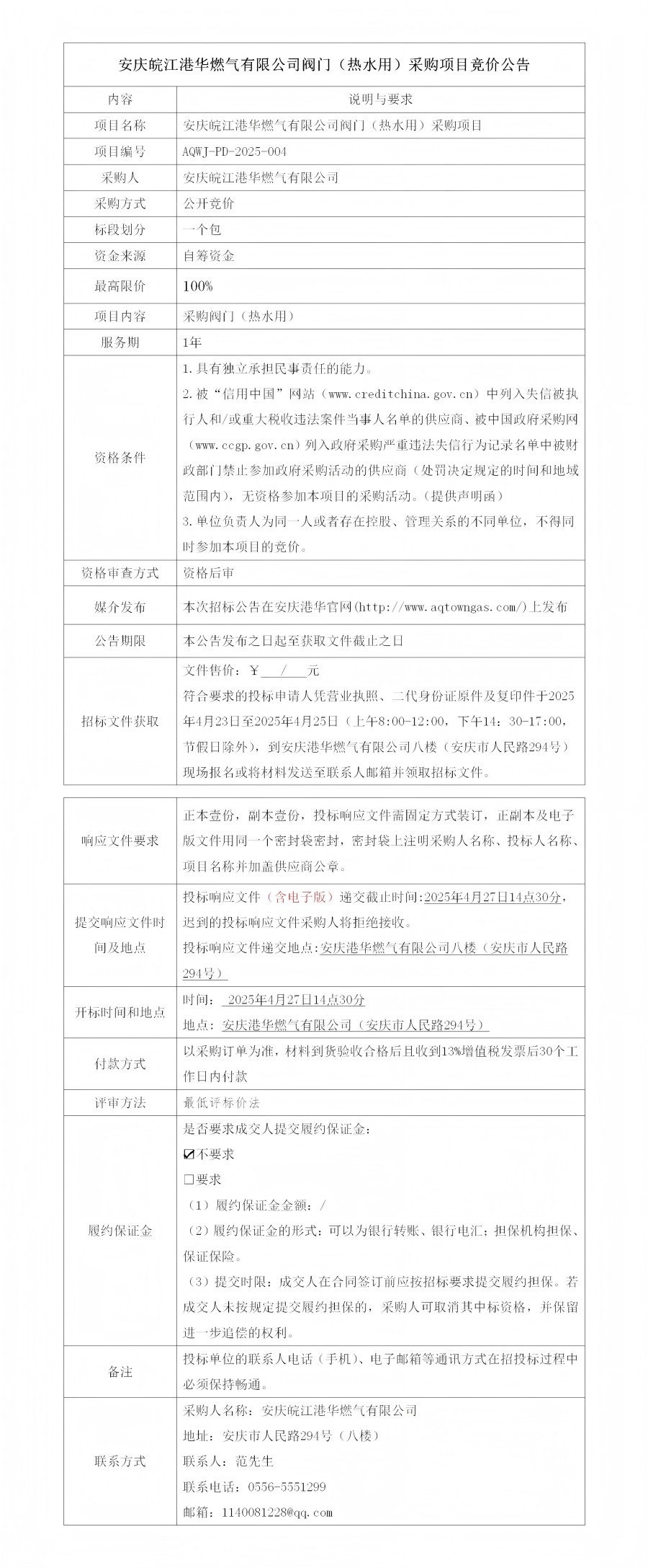 安慶皖江港華燃?xì)庥邢薰鹃y門(熱水用)采購項目競價公告