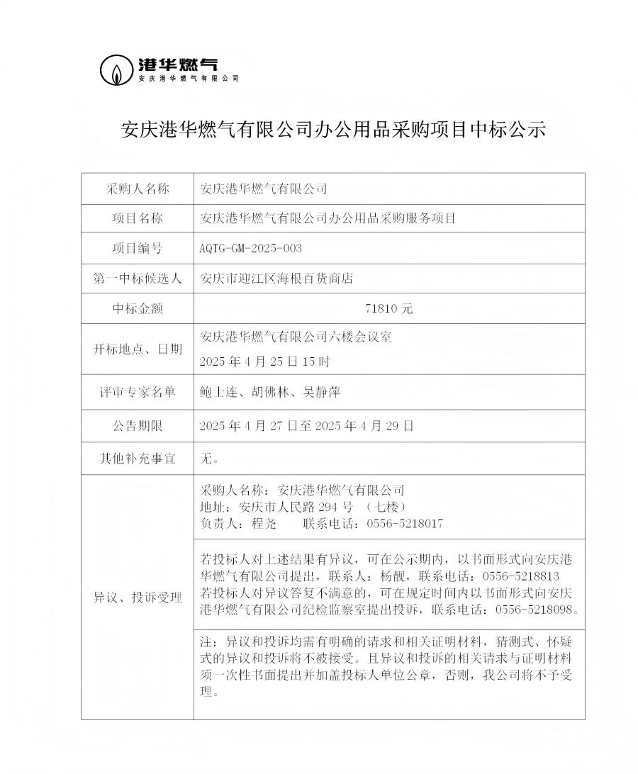 安慶港華燃氣有限公司辦公用品采購項目中標公示 發(fā)布時間:2025-04-27    閱讀次數(shù):1789次