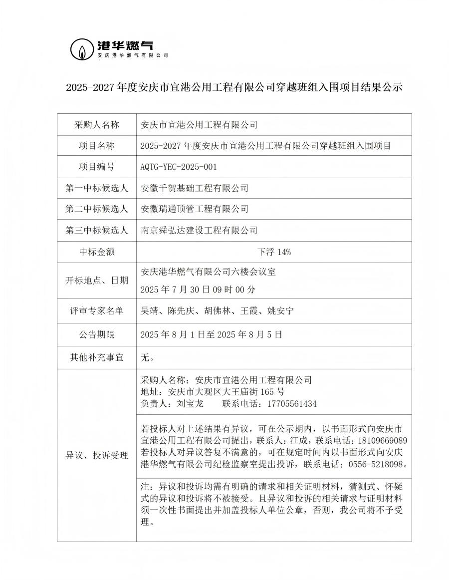 2025-2027年度安慶市宜港公用工程有限公司穿越班組入圍項(xiàng)目結(jié)果公示 發(fā)布時(shí)間:2025-08-01    閱讀次數(shù):1643次