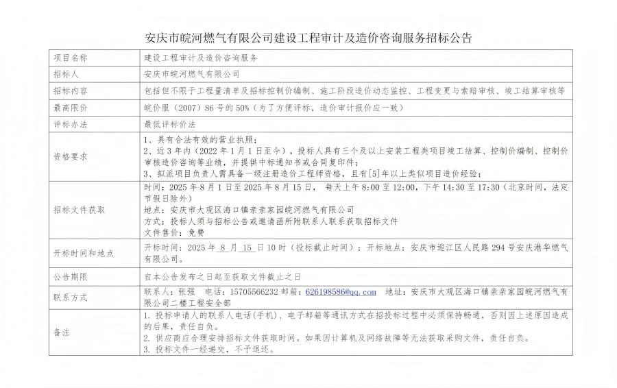 安慶市皖河燃氣有限公司建設工程審計及造價咨詢服務招標公告 發(fā)布時間:2025-08-01    閱讀次數(shù):1319次