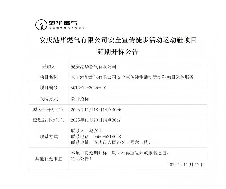 安慶港華燃?xì)庥邢薰景踩麄魍讲交顒舆\(yùn)動鞋項目延期開標(biāo)公告