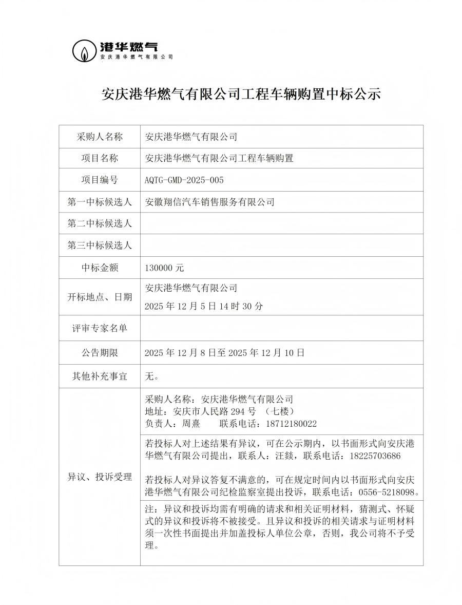 安慶港華燃?xì)庥邢薰竟こ誊囕v購(gòu)置中標(biāo)公示